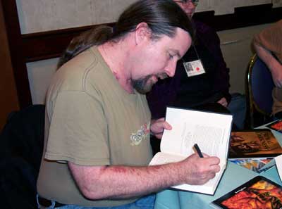 Who is it that does all those wonderful skull paintings for the US Necrosope books? Bob Eggleton! That's who, and here he is signing his section of the Companion.