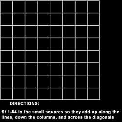 this time around. The Czechs have published the first four Necroscopes, and since they are a hit over there I imagine that's the source of the invitation. (I've just signed the contract for No. 5, Deadspawn.) Oh, yes: and they recently did a collection titled Nekros! Other things, places: A Japanese publisher has had me rework the introduction to The Compleat Crow for a new Japanese edition. I'm truly pleased about this because they do such beautiful editions. (I think it was about fifteen years ago that a different outfit -- Kokuscho Kankhokei -- did The Caller of the Black in a gorgeous hardback edition with the original Arkham House Herb Arnold jacket.) But the new publisher will also reprint a recent Tor Cthulhu Mythos collection, with my story Big "C", and they've asked to see the first five book in ... you guessed it: the Necroscope series. I'm about to sign contracts for the 2nd Necroscope, Wamphyri!, in Germany. The Germans are splitting the books in half and doing them in two volumes per title. I'm still waiting for the British contracts on Defilers and Avengers from Hodder and Stoughton, and I'm now on to the last four chapters of the latter -- and last -- book. Some great news: Paul Stanczykowski has won a contract from Hodder and Stoughton; his "staked skull" (what else?) jacket will grace Avengers! I am really delighted for Paul, and Silky will be sending a print of the cover off to Shadoe to put on the site, this is coming soon. Keith Grant-Evans still has copies of Dangerous Ground for sale. This is a really rocking CD, and carries a couple of voice-overs by yours truly on the first and last tracks. When these CDs are gone they're gone for good. And incidentally, I don't earn a penny from this music ... it was just such a real pleasure to work with these great guys. I've been trying out your puzzles with great interest, but -- the real brain-teasers are mathematical. Try this one: A big square is made up of 64 smaller squares (a four-inch square, equally divided into 64 half-inch squares). The numbers that will fit in these boxes are, obviously, 1 to 64. Put them in order so that the sum of each horizontal and vertical line, and of the two diagonals, all come out to the same total. If you remember, Harry did this in Necroscope with a simple 4 X 4 square. Maybe that will give you a clue, right?